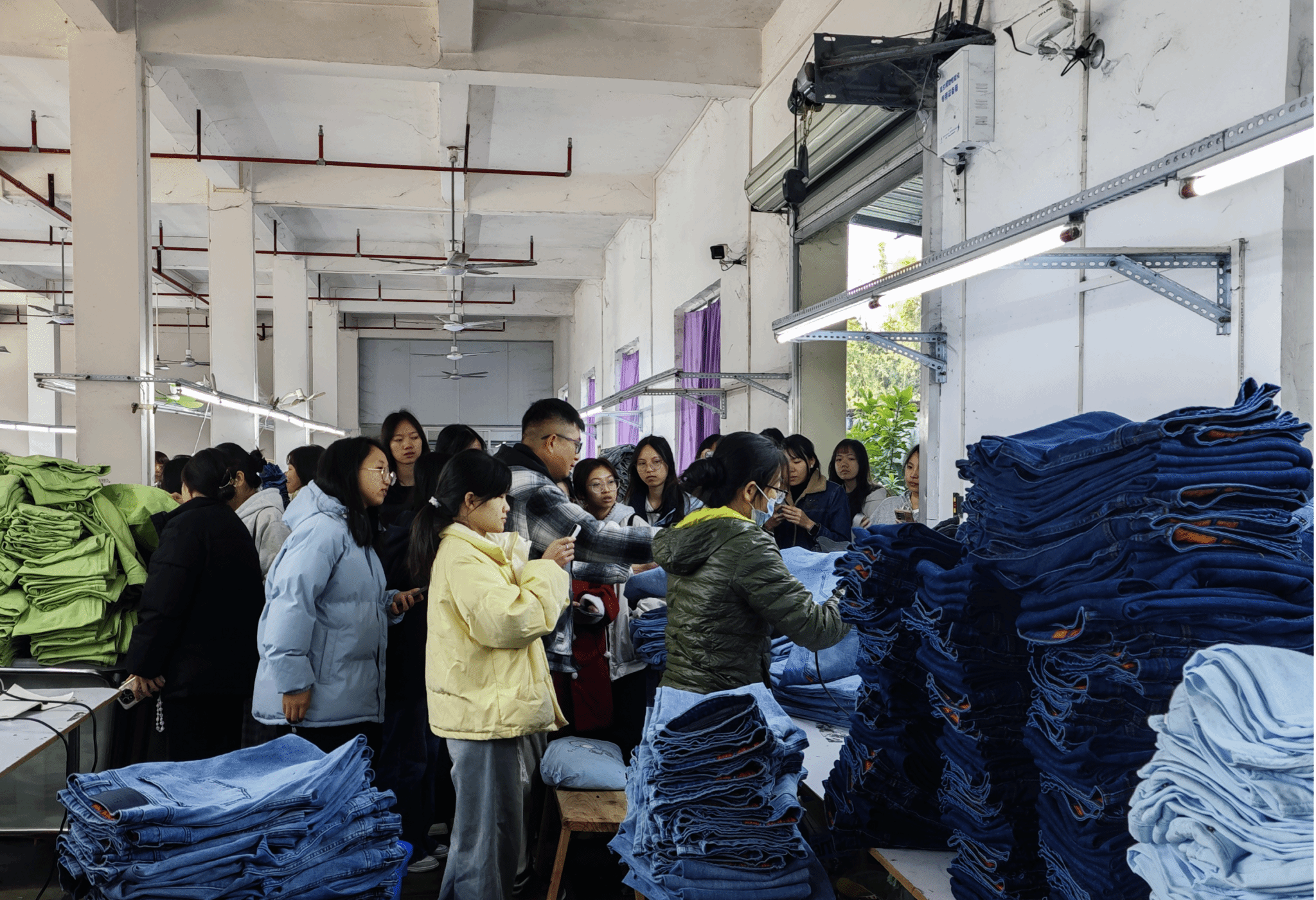 在企业导师黄总的带领下,师生参观了公司各品牌的样品制作间、生产车间、质检区、成品展示区等核心区域,学生们近距离观摩牛仔服装从面料裁剪、缝制到成品检验的全流程。黄总为学生解答参观过程提出的问题,为学生们未来的职业发展奠定了认知基础。