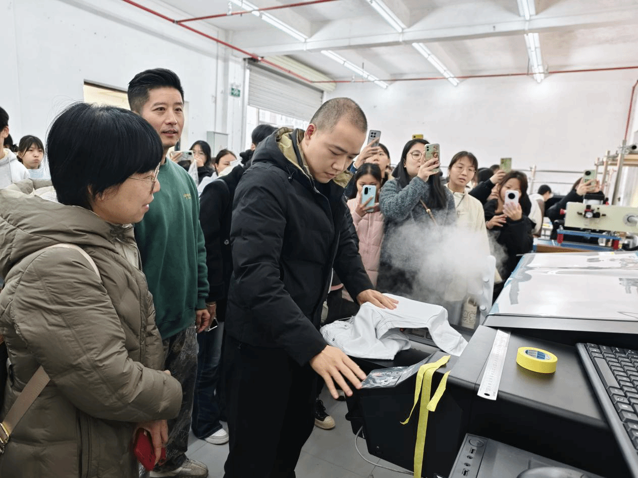 在生产车间,企业技术骨干现场演示了服装数码直喷印花设备的操作流程,讲解了数字化、智能化生产模式如何提升生产效率与产品质量,让学生们深刻感受到福绵纺织服装产业在智能制造转型中的发展活力。