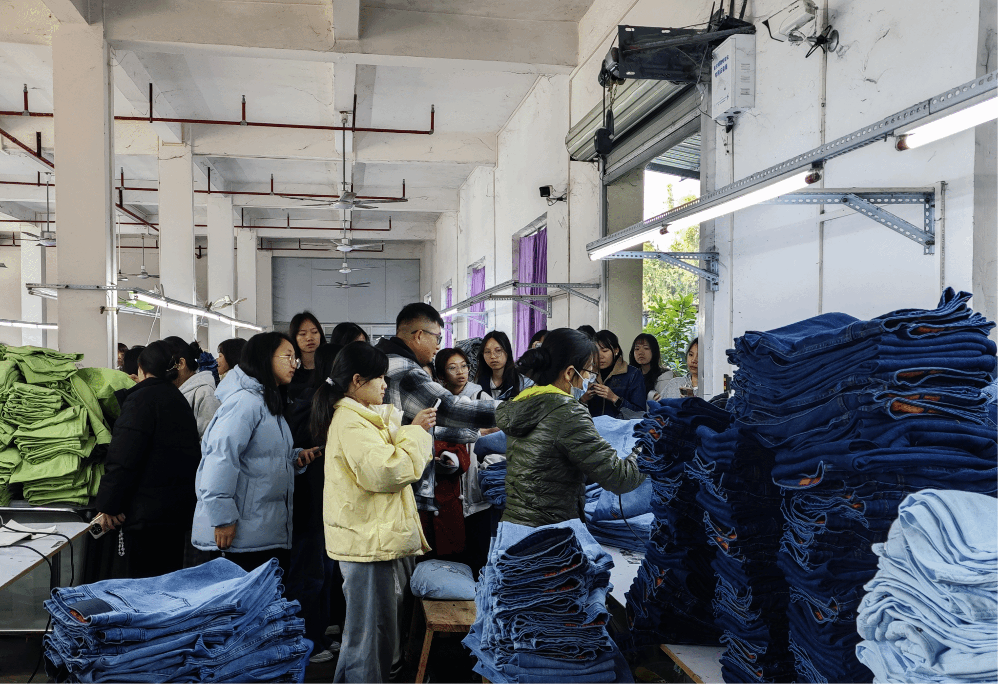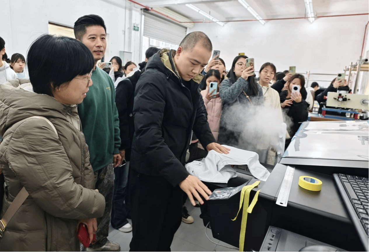 1月6日,师生共同走进校企合作单位——广西云裤科技有限公司。在企业导师的带领下,同学们参观了销往欧美的高端牛仔服饰生产线,并现场观摩了数字喷绘技术的全过程。从图案设计到精准喷印,同学们亲身感受到智能制造在服装产业中的广泛应用。