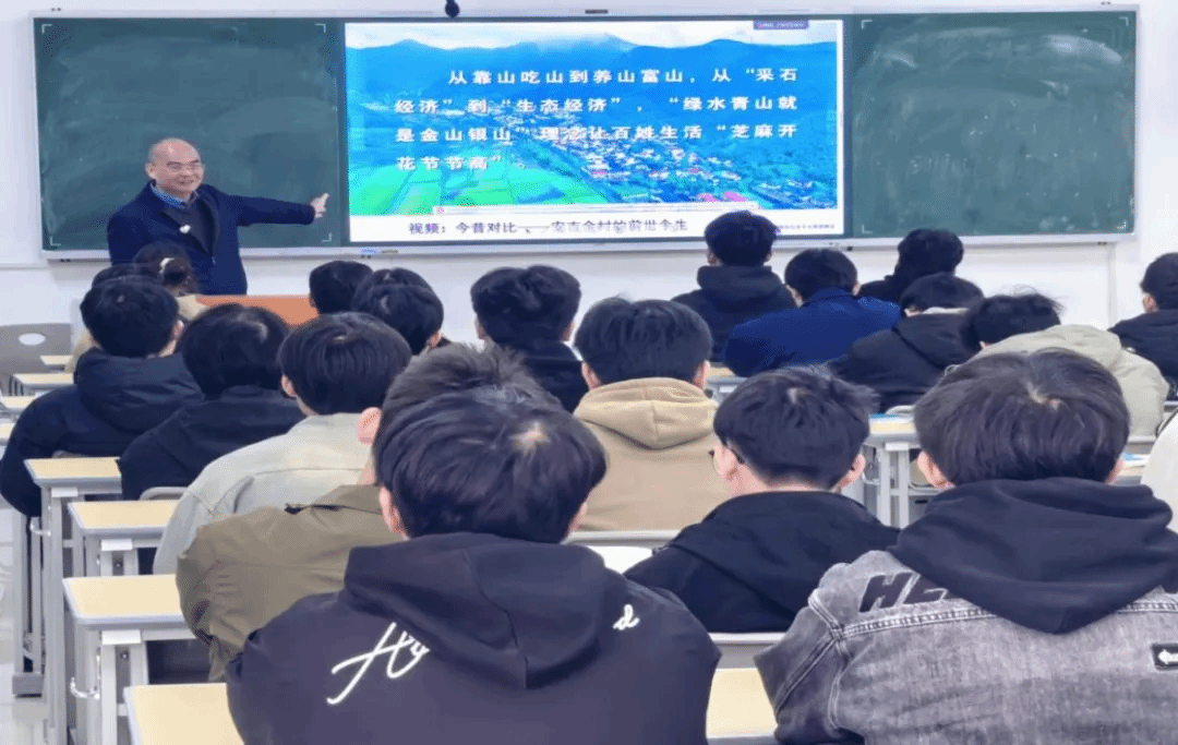 授课过程中,黄书记系统讲授习近平生态文明思想,结合2023年全国生态环境保护大会、2025年全国两会及党的二十届四中全会,向同学们阐释了生态文明建设的重要性,还结合同学们所学专业,着重介绍了我国绿色产业与新能源汽车产业的发展成就,增强其认同感。