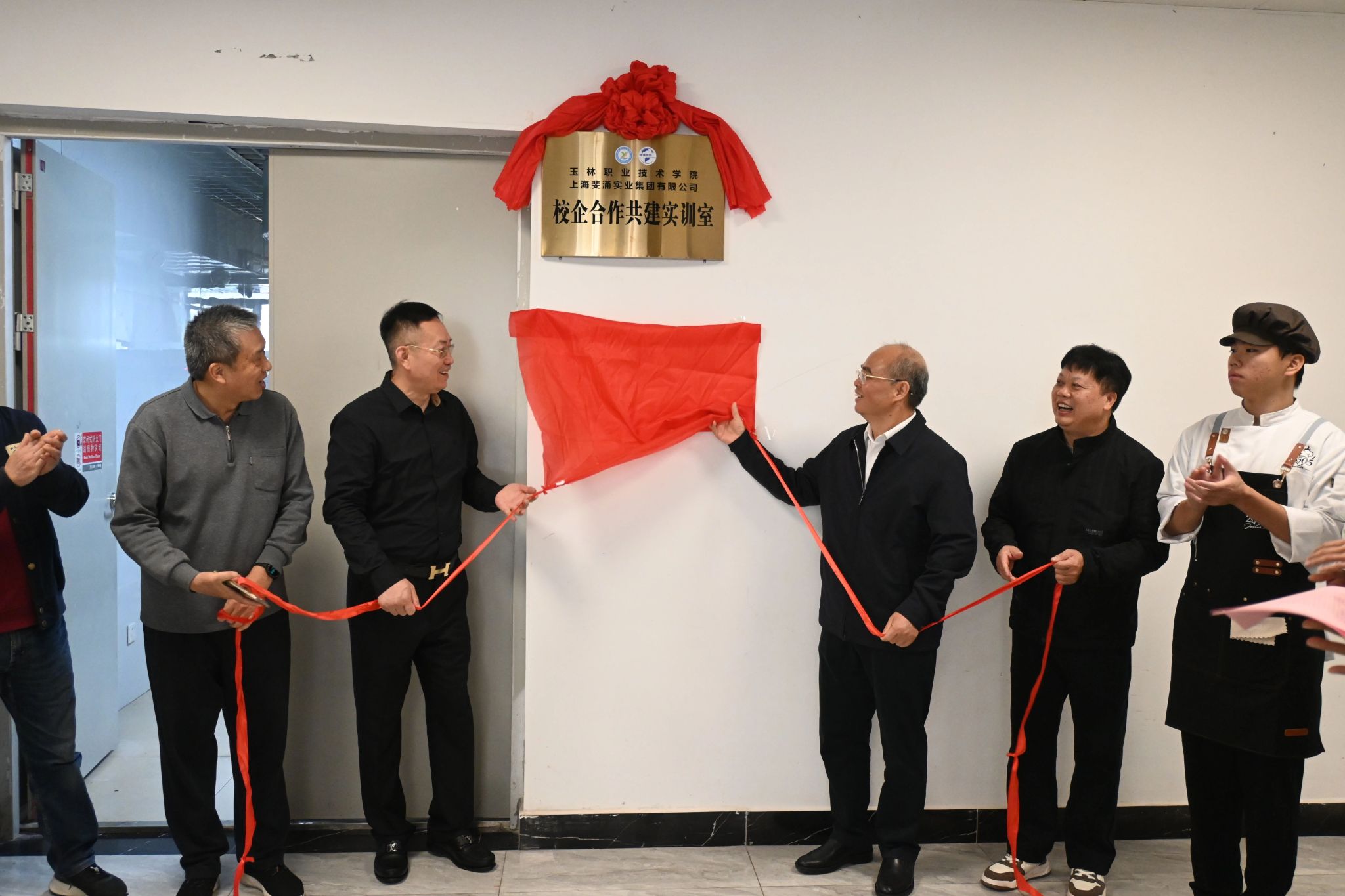 签约仪式后,双方领导移步郁香苑 3 楼 305 中式烹调实训室,共同为 “玉林职业技术学院——上海斐涌实业集团有限公司校企合作共建实训室” 揭牌,这一举措将为学生提供更贴近行业实际的实训环境,推动教学与生产实践深度融合。