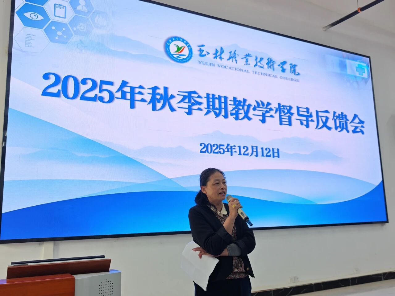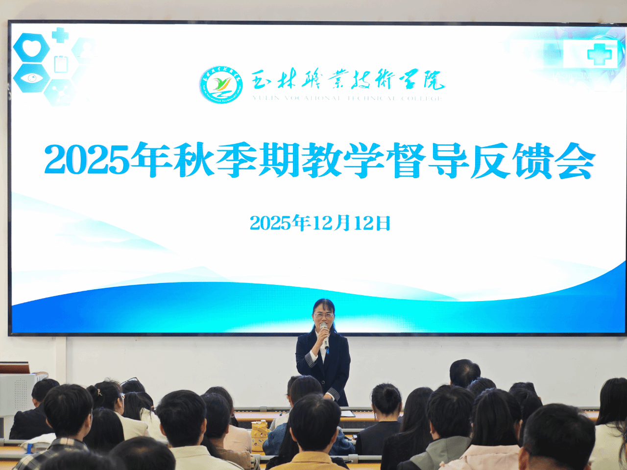 为持续提升教学质量、促进教师专业发展、深入推进课堂教学改革,我校于12月12日召开2025年秋季学期教学督导反馈会。会议由教务处负责人封春年主持,教学督导梁钊华教授和丘林教授分别就本学期督导工作情况进行汇报。玉林职业技术学院副校长刘焕兰出席会议并作总结讲话,全体任课教师参加会议。