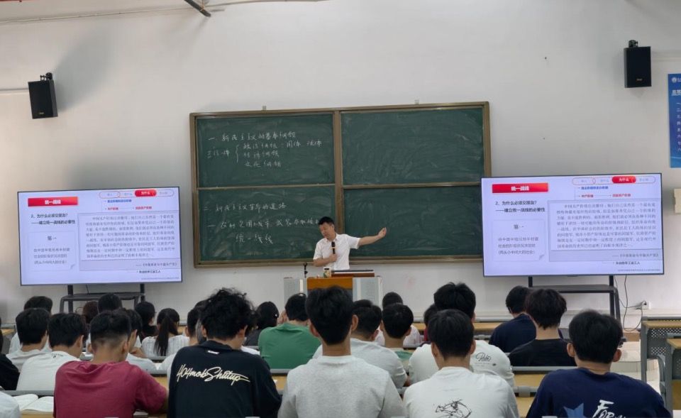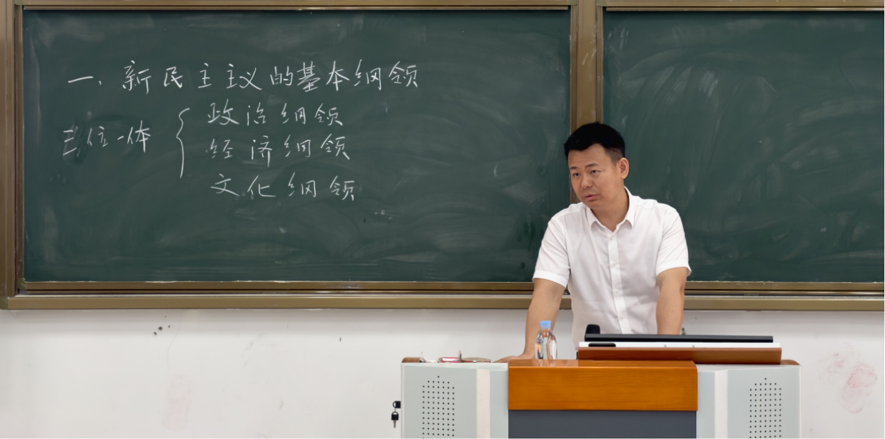 讲授新民主主义基本纲领时,唐彰元结合历史事例,系统阐释政治、经济、文化三大纲领的内涵。在政治纲领部分,他通过互动交流,引导同学们将新民主主义共和国的国体、政体与我国现行国体、政体对照学习,在历史与现实贯通中深化思想认识。随后,他从党的历史教训出发,结合近代中国基本国情与社会结构,深刻阐明“农村包围城市、武装夺取政权”革命道路的历史必然性。