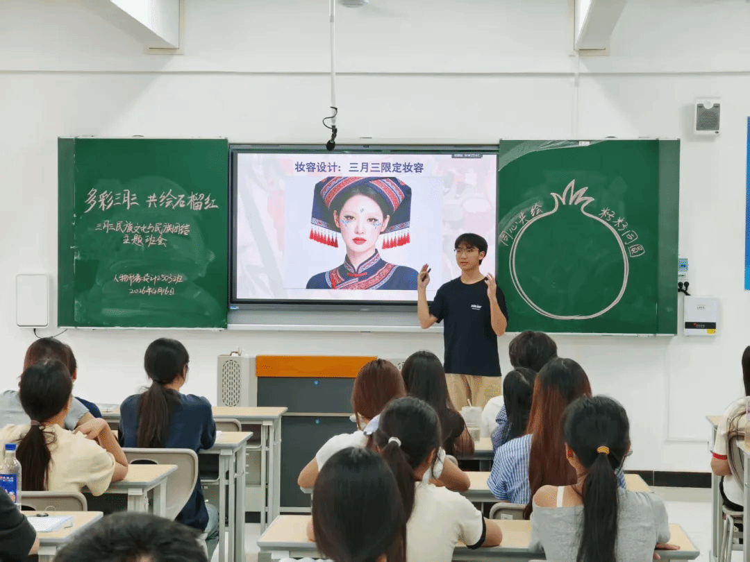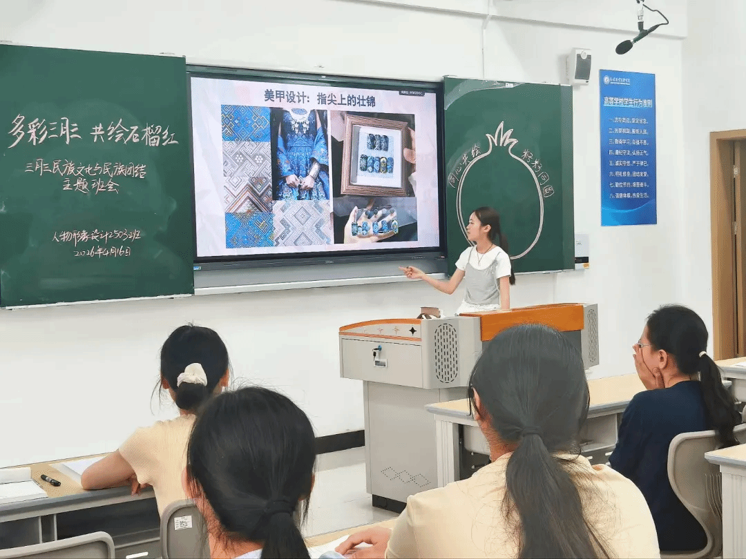 为深入传承和弘扬民族优秀传统文化,铸牢中华民族共同体意识,引导青年学生在专业学习中厚植家国情怀,4月15日上午,唐彰元院长深入联系班级——人物形象设计专业2503班,与全体同学在求新楼304教室共同参与“多彩三月三,共绘石榴红”三月三民族文化与民族团结主题班会课。