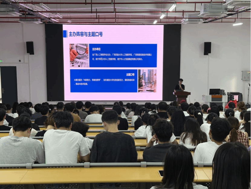 在技术讲解与平台演示后,宣讲会进入大赛核心解读环节。大赛以“AI新势力,青春创想季”为主题,由广西人工智能学会主办,广西民族大学人工智能学院、广西塔易信息技术有限公司、南宁师范大学人工智能学院、南宁市人才发展集团有限公司共同承办。赛事要求极具挑战性与现实意义,参赛者须以3人团队形式,围绕“AI+行业场景应用”这一核心方向进行选题(限农业、电商、智能制造、教育、物流、金融六个方向),并于规定时间内完成作品开发。