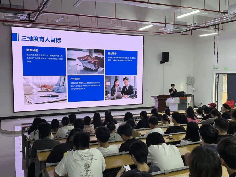 宣讲会以“AI浪潮正当时”开题,结合DeepSeek、豆包、Kimi等国内主流大模型的前沿案例,用通俗化语言阐释人工智能技术如何重塑未来产业格局。随后,技术工程师赵廷韬进一步将视角切入大赛本身,通过对“智能体”等关键技术的解读,帮助师生厘清大赛技术方向,并现场演示智能体开发平台,引发在场师生关于技术落地、创意转化的热烈讨论。