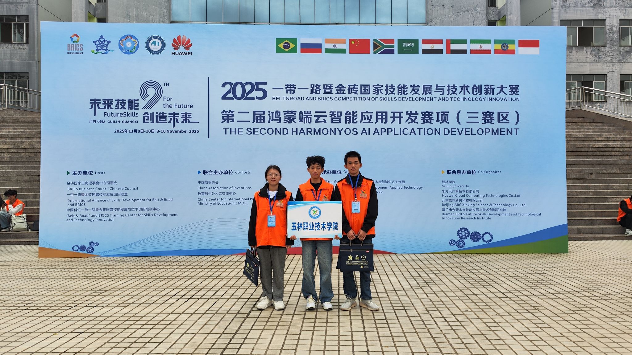 近日,在2025年“一带一路”暨金砖国家技能发展与技术创新大赛第二届鸿蒙端云智能应用开发赛项中,由庞勇军、张倍铖、宾博林老师带领的物联网团队(物联网应用技术专业石豪泽,陈少辉,何青青同学),与全区71所院校、200支队伍近600名同学同台竞技,最终荣获三等奖并晋升全国决赛!